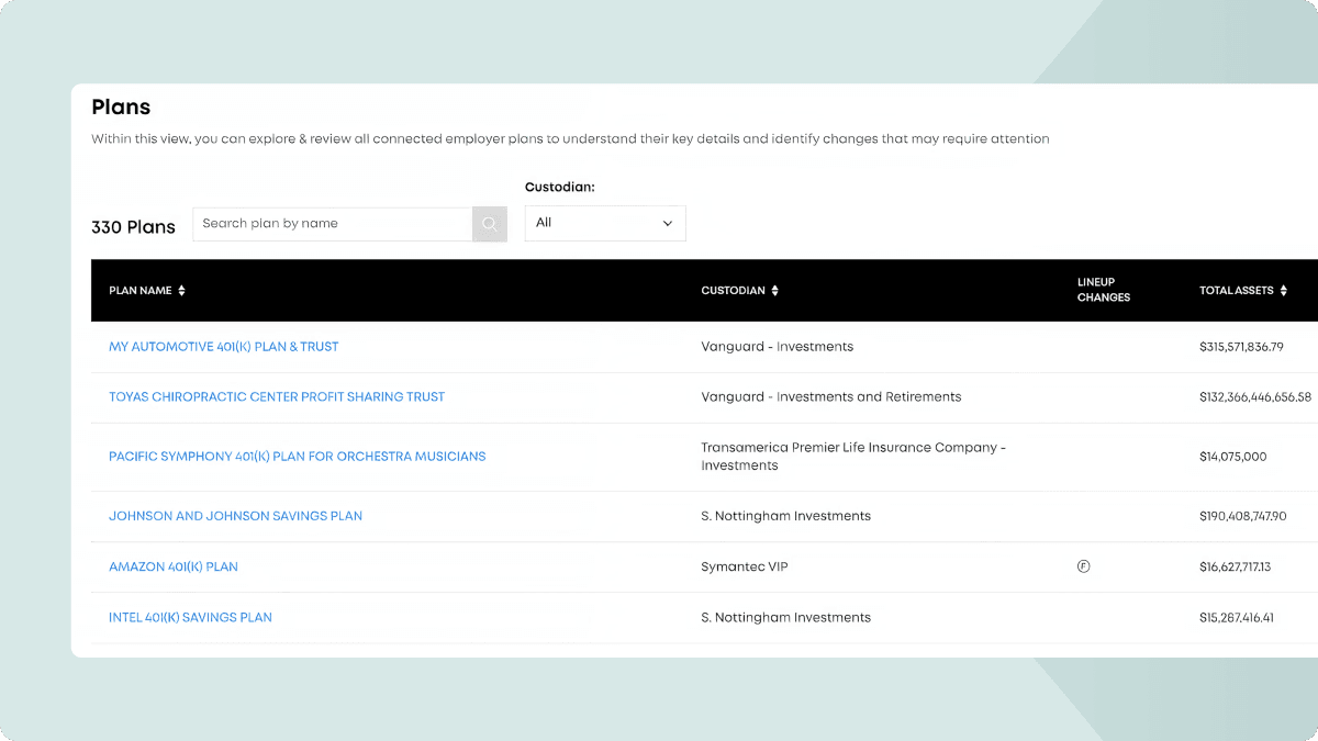 Instead of digging through individual accounts, teams can review fund lineups and plan details in a single view. That means less manual clicking, faster insights, and more time spent on planning, not searching.