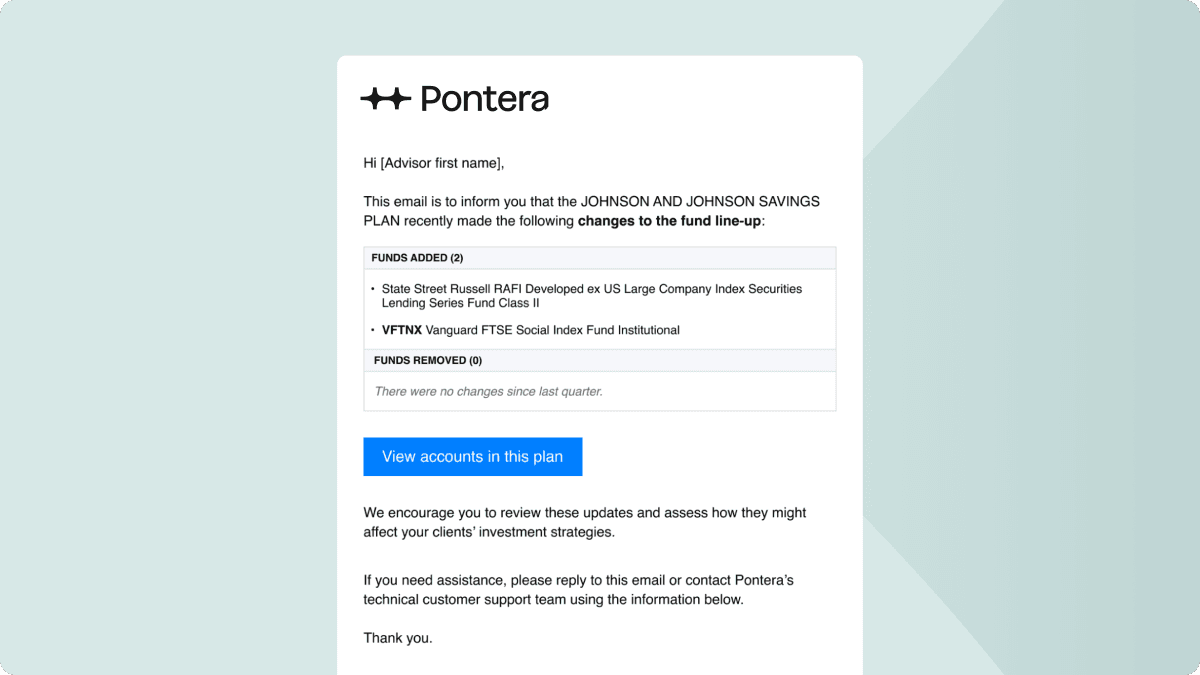 Notifications within the platform are helpful, but you’re not always logged in. And, when fund investment line-ups change, you need to stay on top of them. So we’ve carried these notifications out of the platform and delivered them to your inbox including names, types of changes, and a button that will take you directly to the Accounts Tab in your Pontera instance.