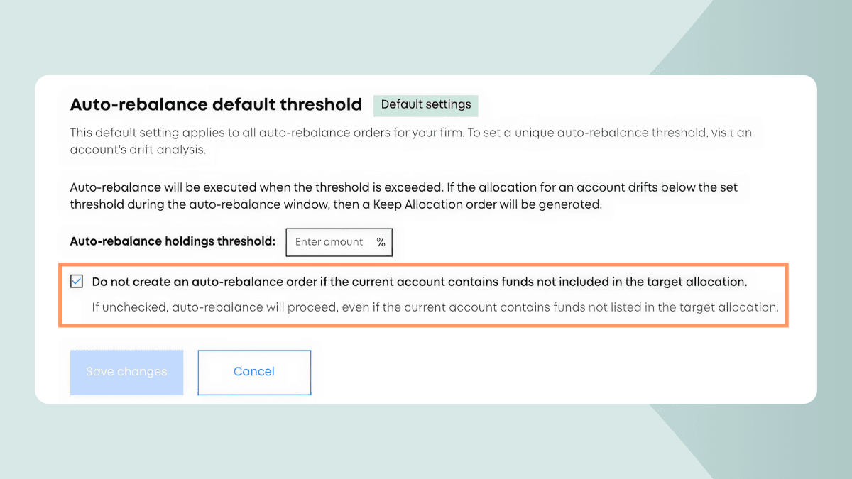 Today when the existing holdings don’t match the target allocation, auto-reblancinging is blocked to protect you and your team from unexpected trades. While this protection has good intentions, we’ve heard your feedback that this doesn’t take into account situations where accounts contain extra funds or legacy positions. So, we’ve introduced a new configurable setting, offering you greater flexibility in how you use auto-rebalance.