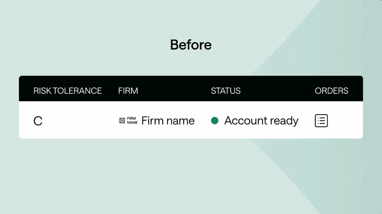 Reorganized accounts page: We renamed “Risk tolerance” to “Risk” and moved the Orders icon to make actions more discoverable. These changes improve readability when managing large datasets.